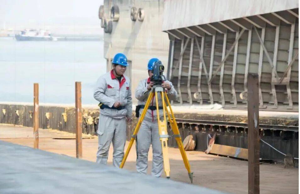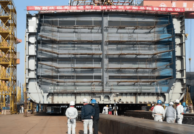 该总段由3个大型环形总段、45个分段组装而成,12台轴线车联动操控,沿斜船台稳行125米,仅45分钟便零误差精准落位。