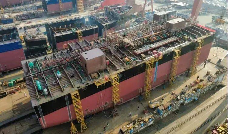 日前,坐落于芜湖高新区的芜湖造船厂,顺利完成国内首次斜船台半船总段轴线车移位作业。